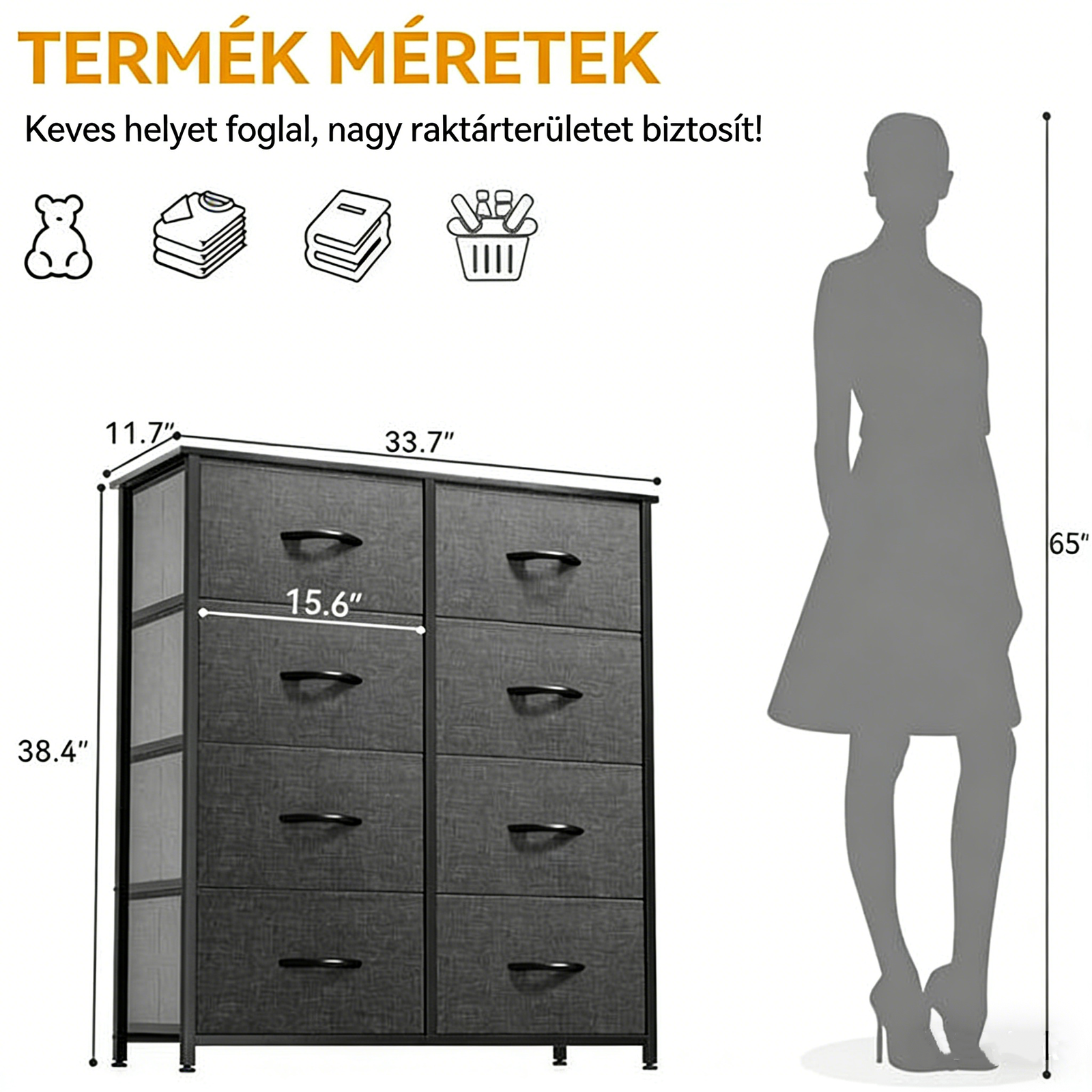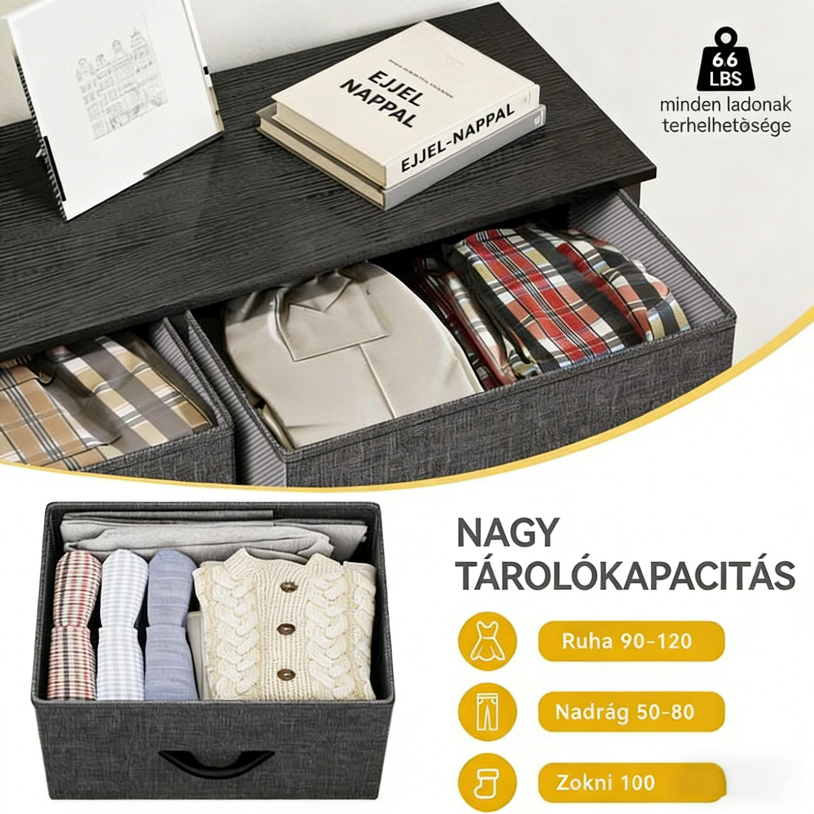 • Ez a tárolókomód nem csupán funkcionális, hanem dekoratív is - a egyszerű, modern dizájnja zökkenőmentesen illeszkedik minden belsőberendezés stílusához. Akár a klasszikus, akár a contemponori hangulatú szobában, ez a rendezőskád felveszi a helyét, és segít, hogy a szobád mindig rendben és tiszta legyen.